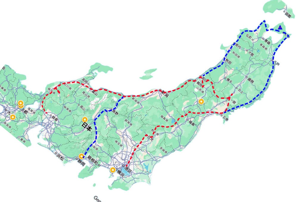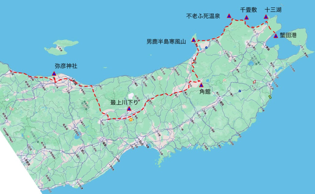地図の赤線は「奥の細道」のコース。青線は奥の細道を外れて廻ってみたいと思っているコースです。