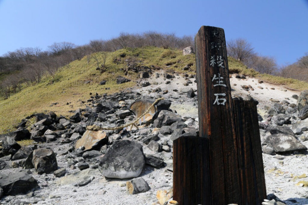 大昔、中国やインドで悪行をつくした「九尾の狐」伝説にまつわる史跡で、狐が化身したと伝わる大きな岩の周辺では、今なお独特な硫黄の香りが漂っています。 また、俳人松尾芭蕉もこの地を訪れ「奥の細道」には、「殺生石は温泉の出づる山陰にあり。石の毒気いまだ滅びず、蜂蝶のたぐひ真砂の色の見えぬほど重なり死す。」と書き、次の句を詠んでいます。