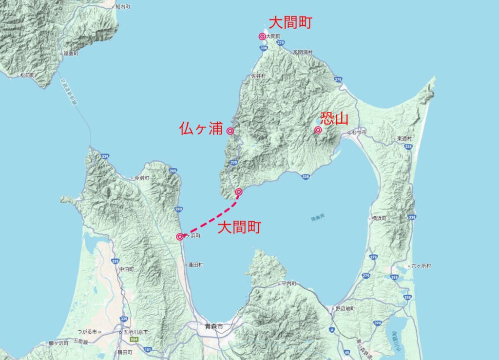 陸路で下北半島の付け根の野辺地まで行き、そこから青森市方面を目指すととんでもない距離があり超遠回りになってしまいます。ここは最短で津軽半島に渡ることの出来る「むつ湾フェリー」を使うのが正解でしょう。