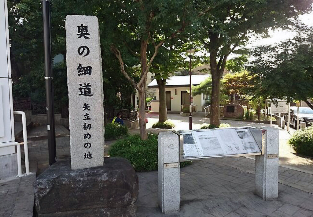 ここは芭蕉が大勢の見送りを受け奥の細道のスタートをきった地なので、自分もここをスタートの地としたいところですが、周りの駐車場を探してみても無いようです。公園入口に「奥の細道 矢立初めの地」の碑が建っているので、車からの撮影でも何とかなりそうなのですが、隣が交番なのでチト躊躇します。